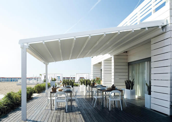 Перголы - прочные и надежные конструкции с моторизованными тентами на алюминиевом или стальном опорном каркасе, которые могут выдержать сильные порывы ветра и нагрузку сухого снега до 10-20 см.