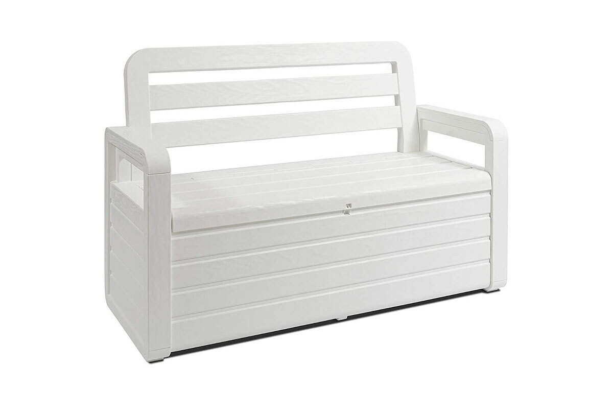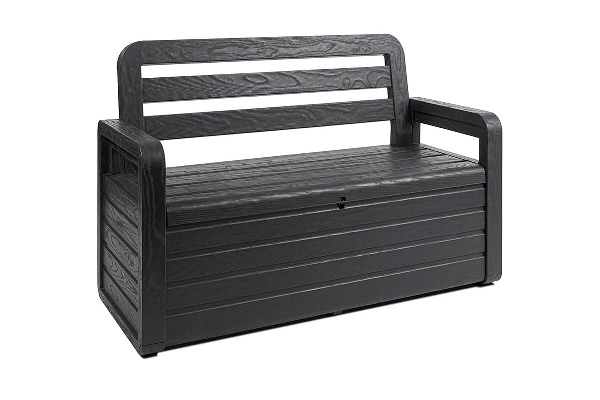 Многофункциональная лавочка создана из прочного пластика, выдерживающего нагрузку до 360 кг, обеспечивая комфортное размещение двух взрослых одновременно.